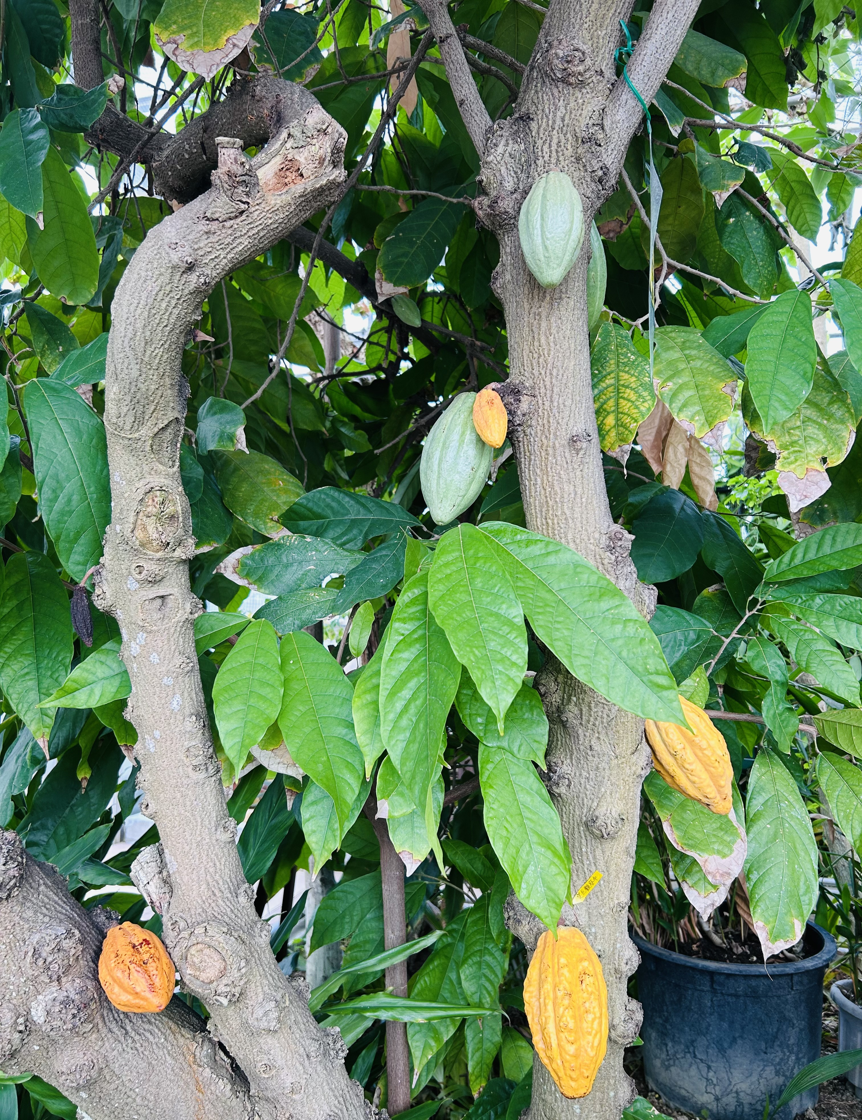 幹に直接実がなる幹成果であるカカオの実は、ラグビーボールのような形。カカオの樹は、長い年月、実をつけてくれるそうです。内藤記念くすり博物館のInstagramで、温室の中でカカオが実をつけているとお知らせがあったので、見に行ってきました😊